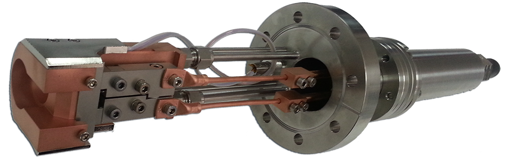 This 4kW evaporator fits though an ISO63CF mounting port and features 4 cc crucible capacity and a dynamic beam deflection system. The ISO63CF mounting flange incorporates all media feedthroughs like high voltage, magnet current and water.